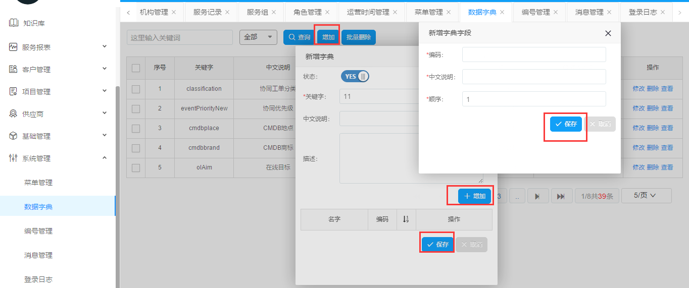 點(diǎn)擊增加按鈕,新增字典字段,填寫完成點(diǎn)擊“保存”即可