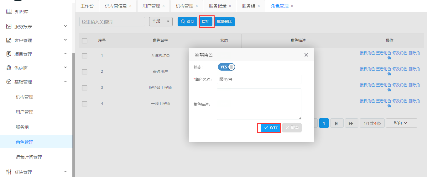 點擊增加。彈出對話框之后填寫角色名稱,您也可以適當描述一下該角色。如果確認點擊保存,放棄點擊取消