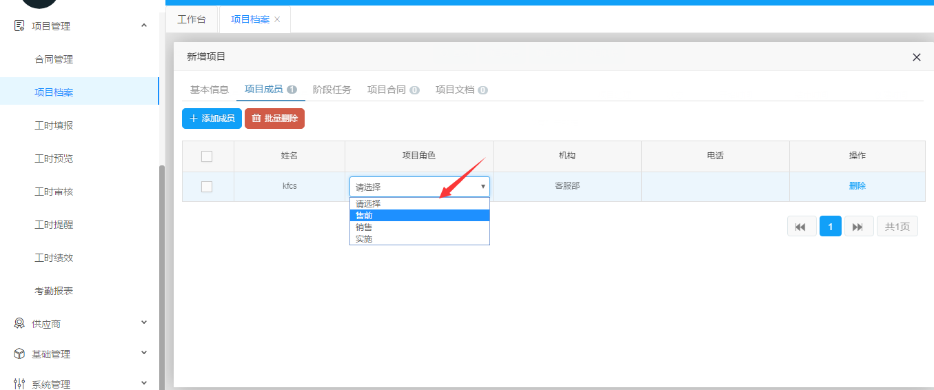 添加成功后,可以選擇成員的項(xiàng)目角色。該界面依舊支持成員刪除和成員批量刪除功能