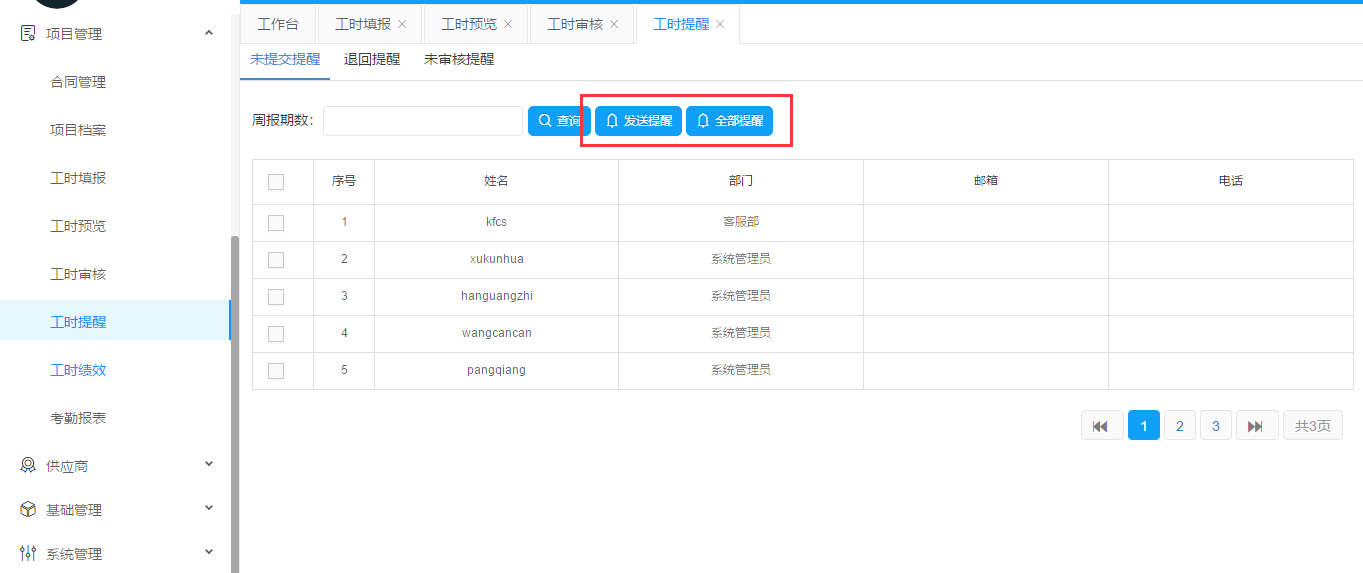 一周內(nèi)沒有審核工時(shí)的領(lǐng)導(dǎo)都會(huì)出現(xiàn)在未審核提醒的列表中,用戶可以勾選未提交用戶,點(diǎn)擊發(fā)送提醒;也可以對(duì)所有未審核工時(shí)的領(lǐng)導(dǎo)發(fā)送提醒,只需點(diǎn)擊全部提醒