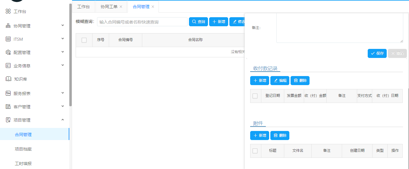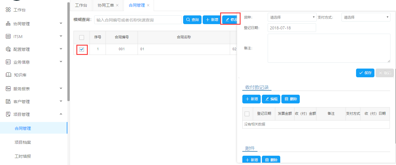 選擇一個(gè)合同,點(diǎn)擊修改。從右側(cè)彈出對(duì)話框,修改表單元素。如果確認(rèn)點(diǎn)擊保存,放棄點(diǎn)擊取消