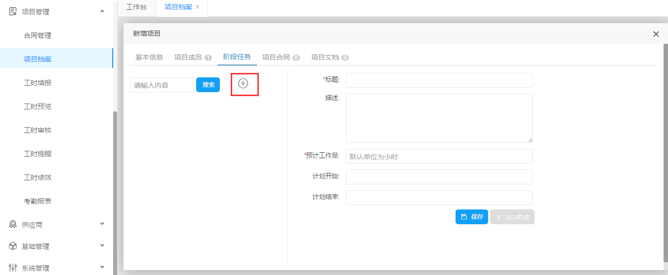 點(diǎn)擊【+】,右側(cè)進(jìn)入任務(wù)信息錄入界面。填寫標(biāo)題和預(yù)計(jì)工作量,其他非必填項(xiàng)選填。如果確認(rèn)點(diǎn)擊保存,放棄點(diǎn)擊放棄修改
