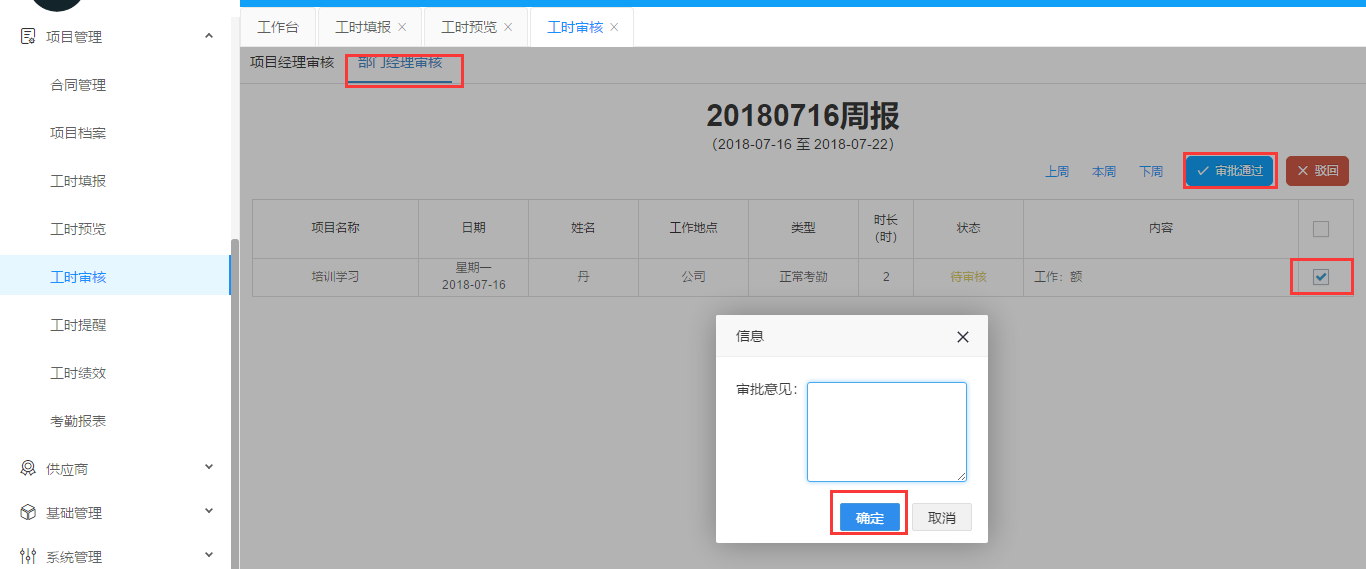 選擇周報(bào)期數(shù),勾選一條或多條工時(shí),點(diǎn)擊審批通過。彈出對(duì)話框之后如果確認(rèn)點(diǎn)擊確定,放棄點(diǎn)擊返回。