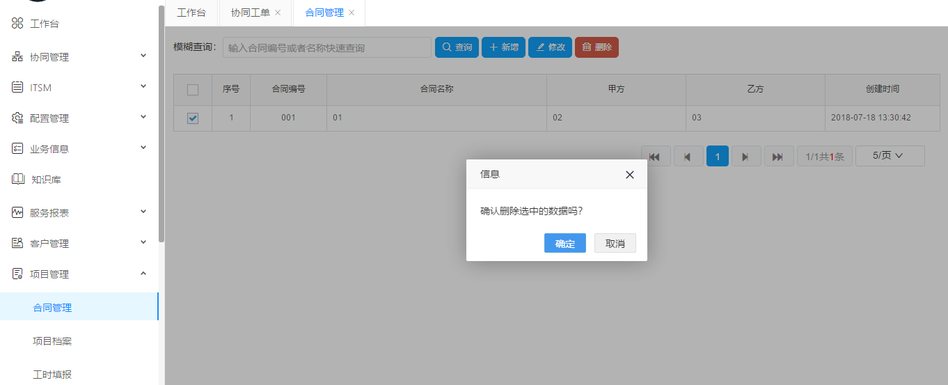 選擇一個(gè)合同,點(diǎn)擊刪除。彈出對(duì)話框之后如果確認(rèn)點(diǎn)擊確認(rèn),放棄點(diǎn)擊取消