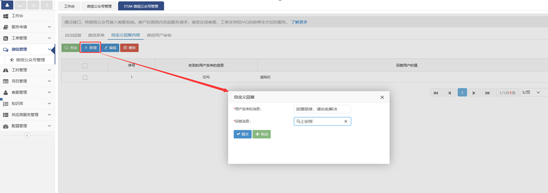 點擊下圖中的【新增】按鈕,彈出自定義回復對話框,設置用戶發來的消息及回復消息,點擊【提交】按鈕,撤回點擊【取消】,如下圖: