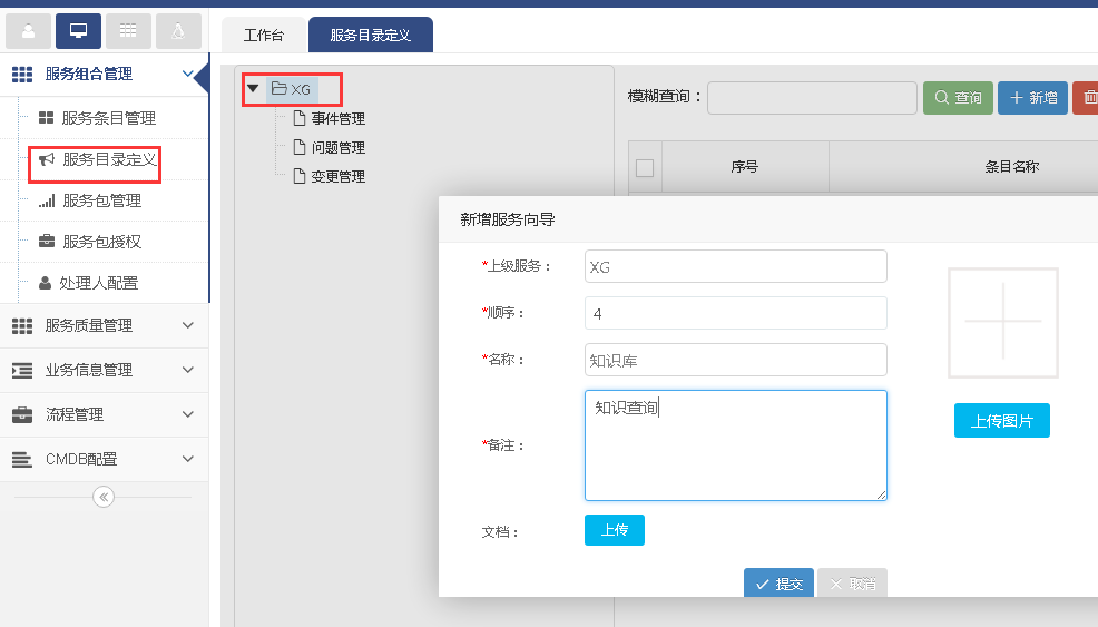 選擇本地流程(即為系統內配置好的流程)時,需要選擇下面的運營時間,選擇了運營時間SLA里才可以設置首次響應計時、處理計時、擱置計時,然后選擇流程(如知識流程),下面的顯示標記我們可以上傳圖片來標識這個服務條目,對條目也可以進行簡單的描述。