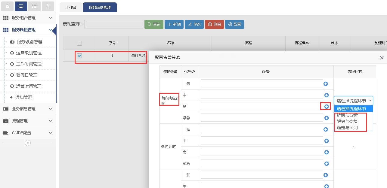 首次響應(yīng)計(jì)時(shí),流程環(huán)節(jié)需要選擇,然后根據(jù)事件的優(yōu)先級(jí)選擇右側(cè)‘+’,進(jìn)行通知信息填寫。