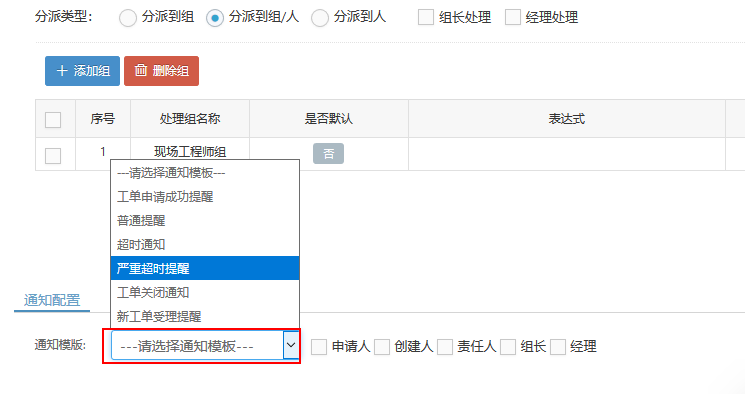 系統(tǒng)內(nèi)置了常用的通知規(guī)則,新工單受理通知、工單關(guān)閉通知、超時(shí)通知等等,選擇合適的模板,指定通知人保存生效。如下圖: