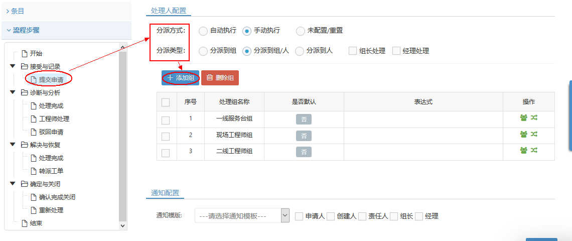 在流程步驟中,依次選擇流程階段如“提交申請(qǐng)、處理完成、工程師處理、駁回...”等,在右側(cè)處理人配置中選擇該流程的分派方式和分派類型。