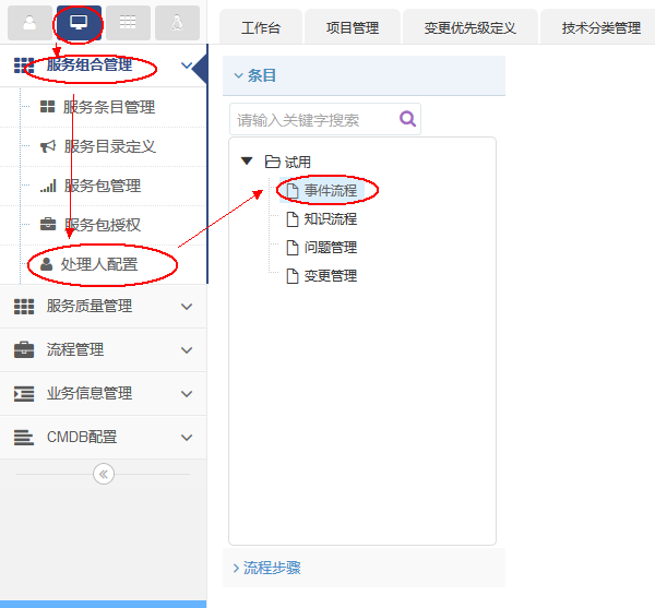 選擇ITIL流程,如事件流程,點(diǎn)擊流程步驟,開始詳細(xì)配置每一步的處理人。如下圖: