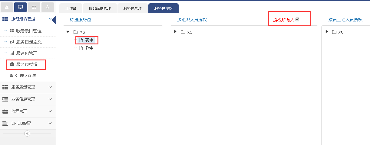 軟件這個服務包里包含了三個流程(變更管理,問題管理,知識管理),然后我們對軟件服務包進行授權,我們授權給客服部xiaojing這個部門成員