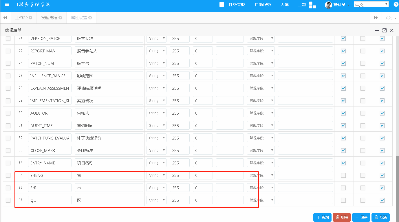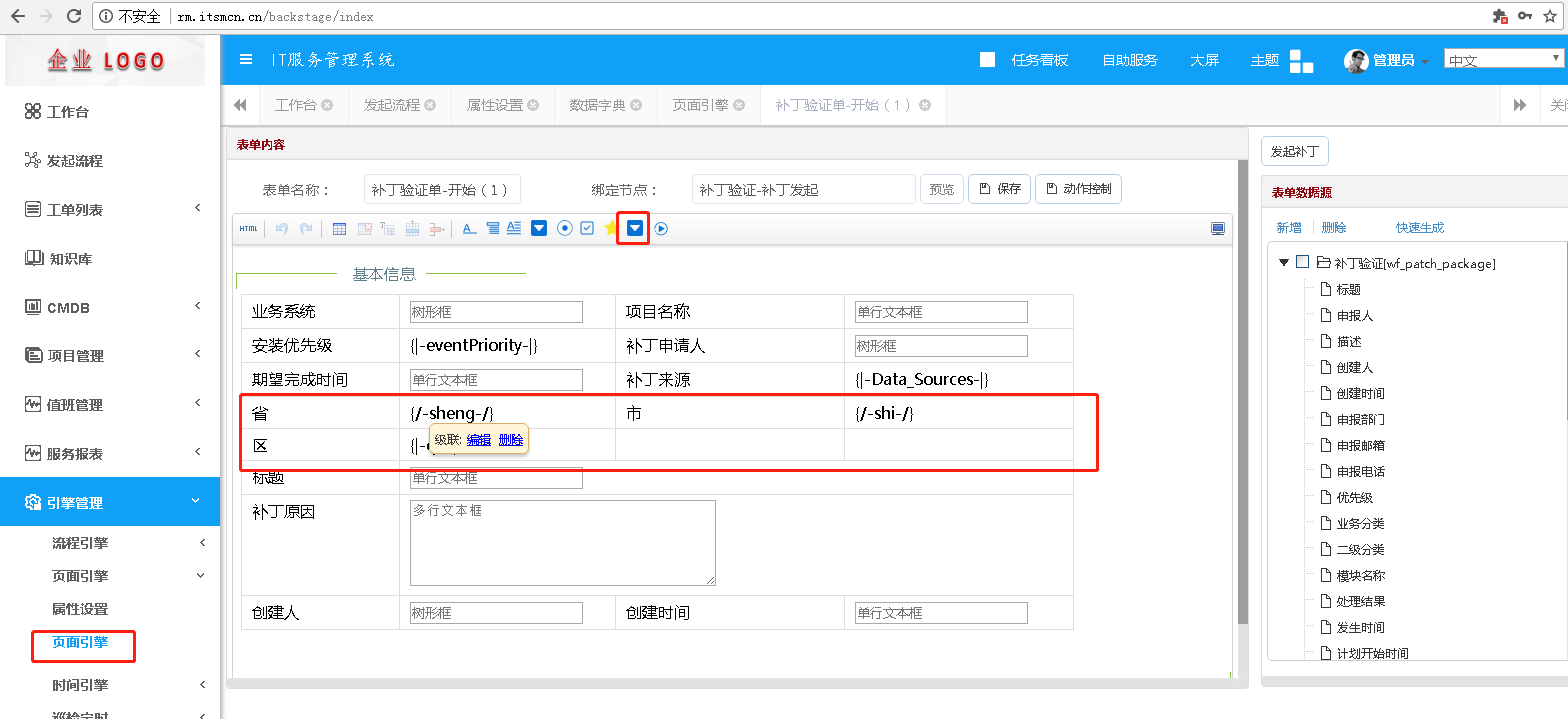 4. 頁面設計器三級級聯功能(如:省、市、區),首先要添加頁面字段,然后給字段進行編碼賦值,在頁面設計器中引用即可。