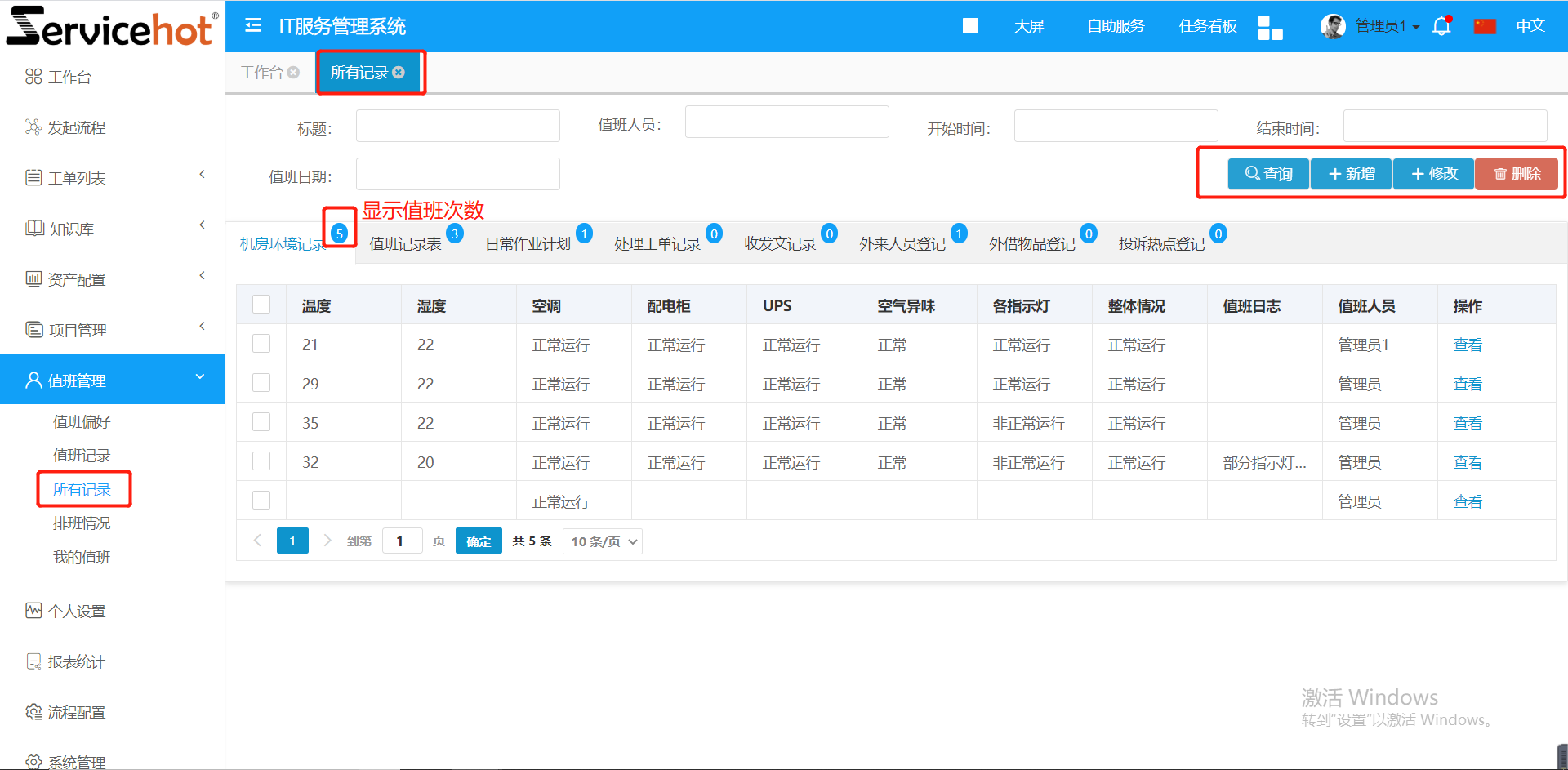 將原有【值班記錄】與【所有記錄】整合,用戶可直接對記錄進(jìn)行新增、修改、刪除等操作;值班記錄分類右上角顯示值班次數(shù),可以直接了解值班數(shù)據(jù)及人員。