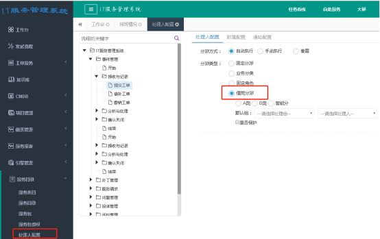 首先需要把排班設(shè)置好,在排班的地方分配好值班人員的崗位,如A崗或B崗;崗位設(shè)置好之后選擇處理人配置按值班分派,選擇崗位,提交的工單便可直接分配給當天值班人員。