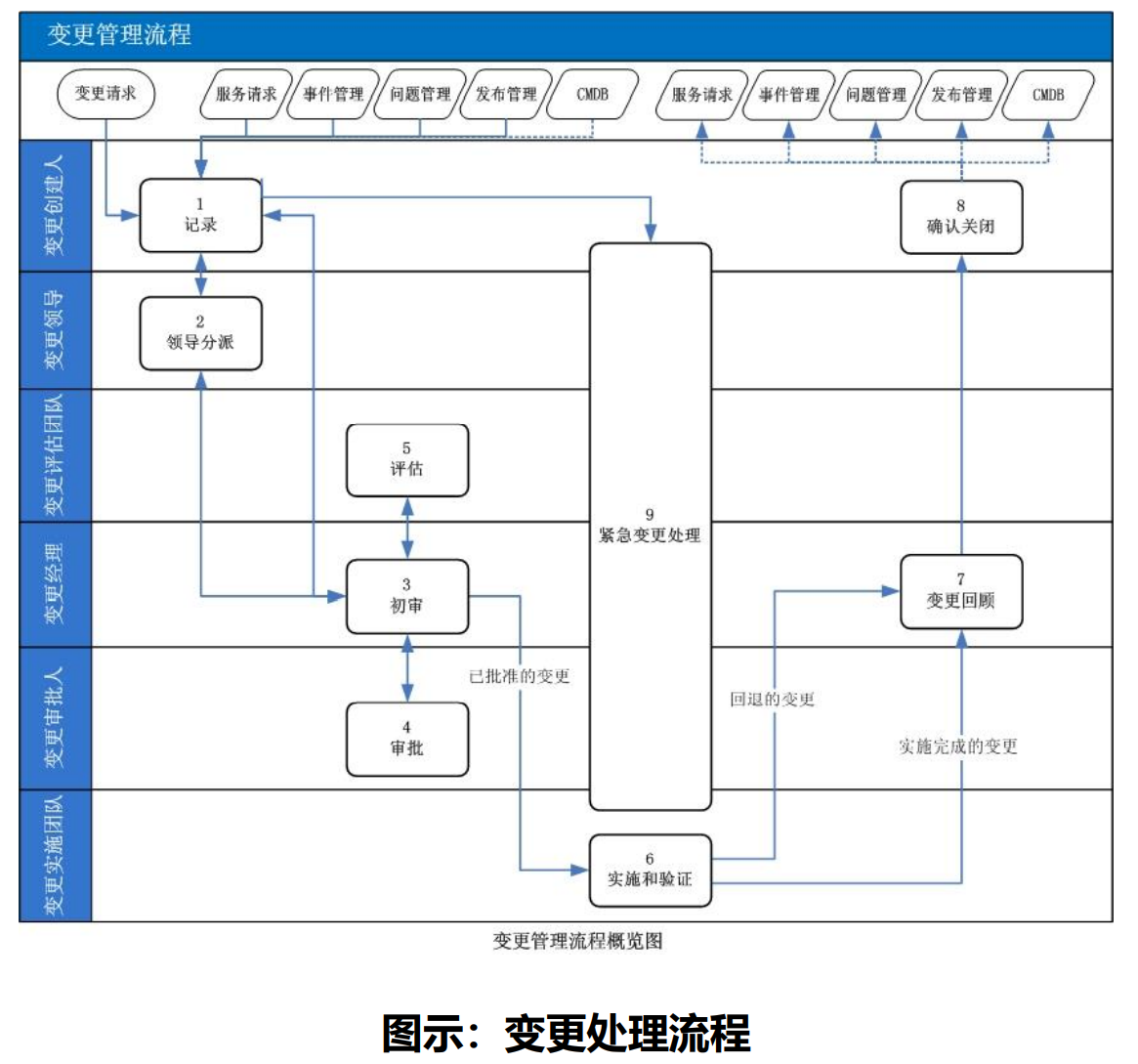 變更是IT部門的工作流程,變更管理是指為在最短的中斷時間內完成基礎架構或服務的任一方面的變更而對其進行控制的服務管理流程,當問題管理通過調查和分析發現問題產生的根本原因,但不能制定恰當的解決方案從根本上予以解決時,問題管理需要向變更管理提交變更請求,從而從通過實施必要的變更從根本上消除問題的根源。變更管理流程是確保在變更實施過程中使用標準的方法和步驟,盡快地實施變更,以將由變更所導致的業務中斷對業務的影響減小到最低。