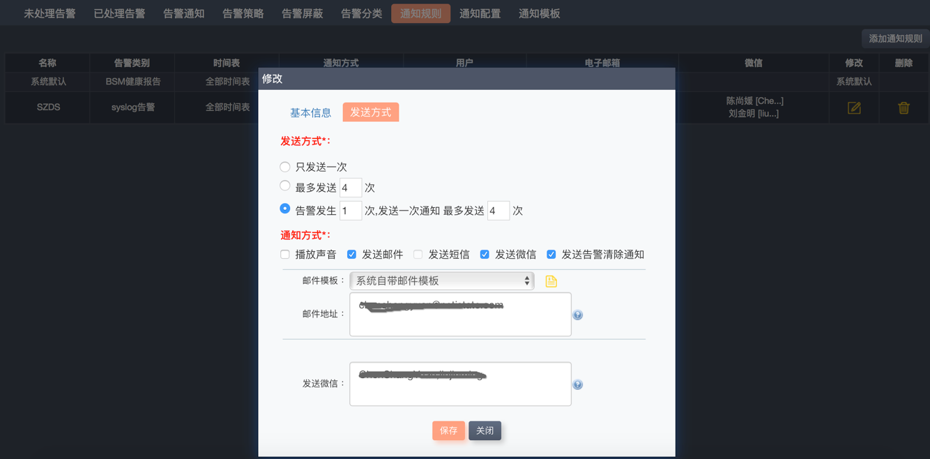 報警通知策略支持按事件分類發送到系統用戶/用戶組,也支持手工填寫系統帳號以外的郵件地址和手機號碼。