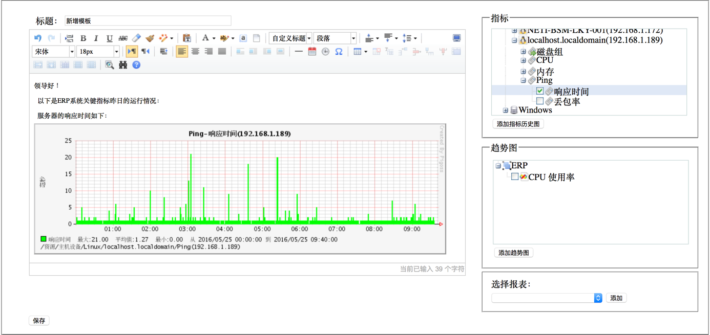 用戶在報告模板中可以靈活排版,除了自己編寫文字報告,還可以嵌入動態的數據對象,包括:被監控的資源指標數據、趨勢曲線、已經存在的統計報表。 系統依據報告模板動態生成的電子運維報告,并以WORD格式呈現和導出。