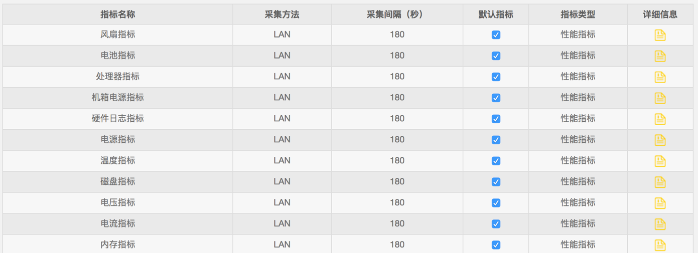 能夠監控到的服務器類型包括:IBM、DELL、HP、ThinkServer、AIX、虛擬化宿主機服務器及其他支持IPMI協議的服務器。能夠監控到的指標如下圖所示: