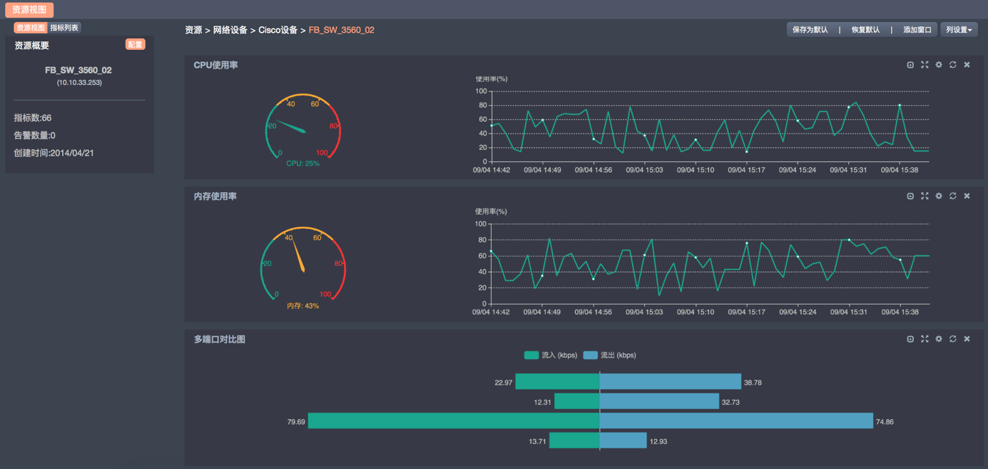 運維監控系統 對網絡設備狀態監測主要通過SNMP方式為主,能夠監控國內外主流廠商的網絡設備,可以監測的相關參數有:CPU使用率、內存使用率、端口管理和運行狀態以及流入流出量、流入和流出使用率、單播接收和發送包數量、網絡流量(平均流量和最大最小值等)和帶寬、網絡鏈路聯通性等。還可以通過Syslog、Trap協議被動接收網絡設備發送的告警,如安全設備一般都會主動將其受到攻擊的信息通過Trap向管理平臺發送。還可以通過ICMP協議檢測線路的性能。監控系統對網絡設備狀態監測和管理包括以下重要的指標: