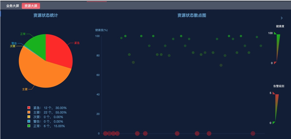運維監控系統不僅支持對業務健康度的大屏展現,而且提供了資源的全局狀態展現。資源狀態統計能匯總監控系統中全部的資源情況,并且可以通過餅圖統計出各類告警級別的資源占比。運維監控系統特有的資源狀態散點圖,能以動態方式呈現海量資源健康狀態分布,方便運維人員從全局觀看資源健康情況。