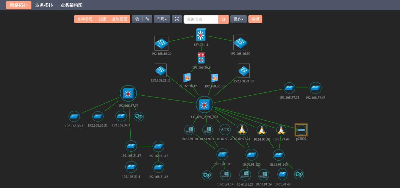 運維監控系統提供了自動發現拓撲功能,能夠發現全網拓撲、指定網段拓撲、路由拓撲,能夠自動關聯系統已經監控的設備的狀態在拓撲圖上實時顯示。系統還支持自定義拓撲功能,管理員可以自行增加各種管理視圖,并以可視化圖形的方式展現各種管理視圖。每個管理視圖都將展現不同資源之間的關系、資源的當前狀態和告警報警情況。每個管理視圖也可以設置不同的標題和背景圖。在自定義拓撲頁面能夠顯示拓撲元素的告警信息和資產信息等數據。