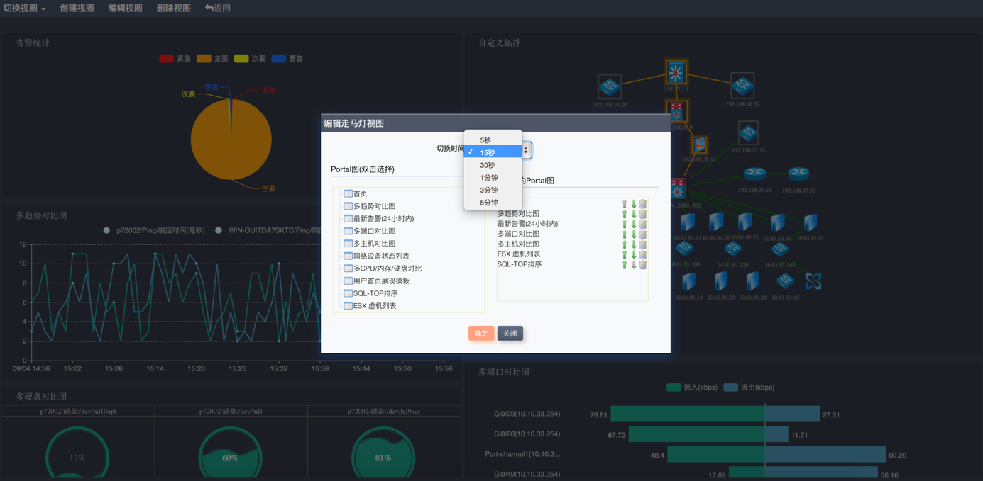 運維監控系統對于不同用戶創建的自定義Portal視圖,可以通過 “走馬燈”的方式進行多Portal視圖的輪詢展現功能。通過對不同的自定義Portal視圖進行間隔的切換展現,能夠使相關的人員能夠知道當前IT網絡環境中所關注資源的整體運行狀態,了解每個部門或者用戶重點關注的資源實時狀態,如下圖: