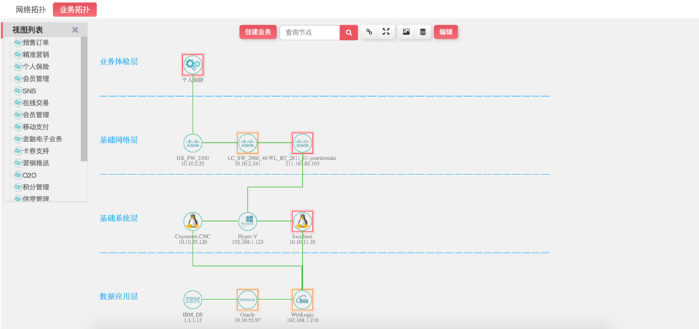 底層的設備故障直接影響到上層業務的運行,通過業務拓撲視圖,解決了故障定位不清晰,層級依賴不清晰的問題,為“自上而下”排查故障提供依據;
