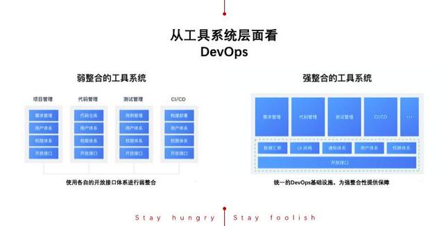 DevOps落地,研發交付的每個過程都離不開工具的支撐。傳統的方式,是自己搭建零散的弱整合工具系統,比如我們用Gitlab來管理代碼,根據企業的實際情況尋找合適的分支管理方法;我們用Jenkins來做持續集成;使用selenium來做自動化測試;使用ansible來自動化部署;使用chef或者puppet來管理基礎環境等等。這種情況的問題一是系統完全需要自己維護,成本高,不穩定;問題二是子系統之間存在隱性墻,缺少數據共享/權限共享/系統交互等功能。目前大型金融以及互聯網企業普遍采用強整合的統一DevOps平臺。